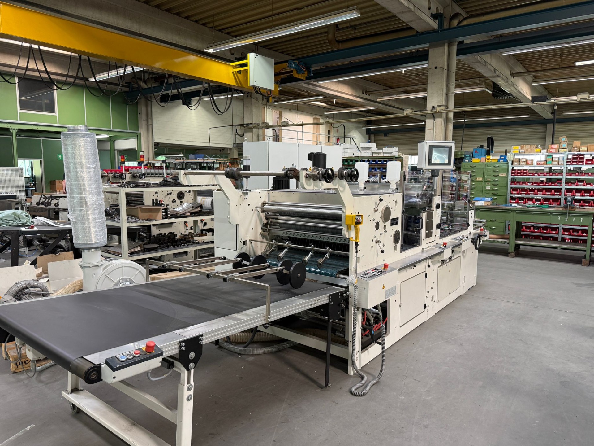 KOHMANN F-1120/2 / Rok výroby: 2002 / Kompletní renovace v roce 2025 / Okénkovací stroj na lepení podšívkových materiálů do kartonových polotovarů / Dvoupruhový / Kompletní renovace v roce 2025 / Doplňky: Kontrola chybějící fólie, antistatický režim a detekce dvojitého archu / Kompletně nová lepicí jednotka / Nová elektrická instalace / Nový měnič a pohony / Nové řemeny / Nová čerpadla / Konfigurace: Časový pásový podavač / Stanice řetězového transportu / Lepicí jednotka / Sací pásový transport / Stanice pro lepení a podšívkování oken / Provoz 1, 2, 3 nebo 4 kusů / Výdejní stůl / Pohon stroje / PLC řízení / Rozměry polotovaru a okna / Délka polotovaru: 100 - 1.230 mm / Šířka polotovaru (jedna dráha): 80 - 1.120 mm / Šířka polotovaru (dvoupruhová): 80 - 545 mm / Délka fólie a podšívky: 60 - 800 mm / Šířka fólie-podšívky (jeden pruh): 30 - 840 mm / Šířka fólie-podšívky (dvou pruh): 30 – 605 mm / Tloušťka fólie: 0,03 - 0,3 mm / Tolerance aplikace fólie na karton ve směru pohybu: Tolerance aplikace fólie na karton v příčném směru: přibližně 0,5 mm / Maximální průměr role okenní fólie-podšívky (standardní): 550 mm / Vnitřní průměr okenní fólie-podšívky: 75 mm / Materiál kartonu: 200 - 2.000 g/m² / Vlnitá lepenka: mikrovlna do tloušťky 6 mm / Systém zvedání pásu zpracovává vlnitou lepenku do tloušťky přibližně 3 mm, v závislosti na velikosti polotovaru / Mechanická výrobní kapacita: Provoz 1 kus (délka polotovaru > 610 mm): 200 kusů-minuta-pruh / Provoz 2 kusů-minuta-pruh / Provoz 3 kusů-minuta-pruh / Provoz 3 kusů-minuta-pruh (délka polotovaru < 385 mm): 600 kusů-minuta-pruh / Provoz 4 kusů-minuta-pruh (délka polotovaru < 270 mm): více než 600 kusů-minut-pruh